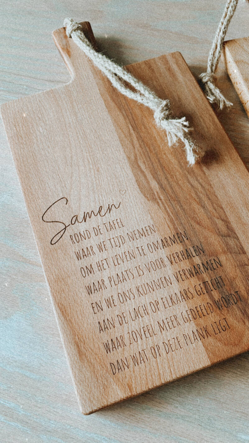 De gravering op deze plank kies je helemaal zelf, onderaan deze pagina kan je enkele voorstellen vinden. Maar we helpen je ook graag met een ontwerp ervan.